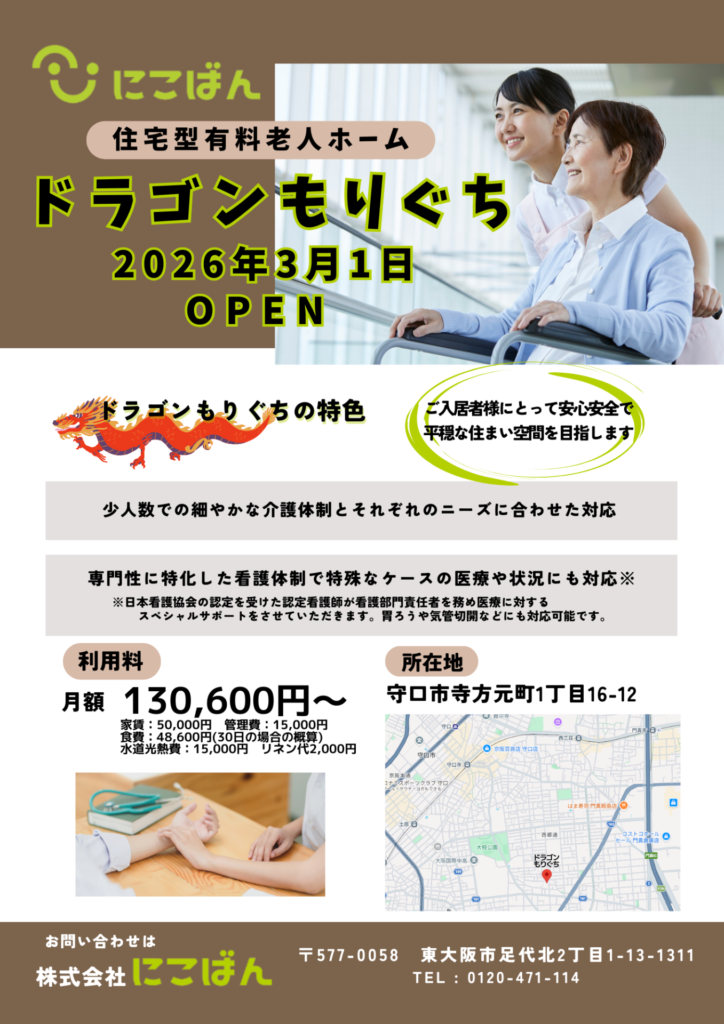 自社で2棟目となる住宅型有料老人ホーム「ドラゴンもりぐち」を守口市寺方元町にOPENさせていただきました。